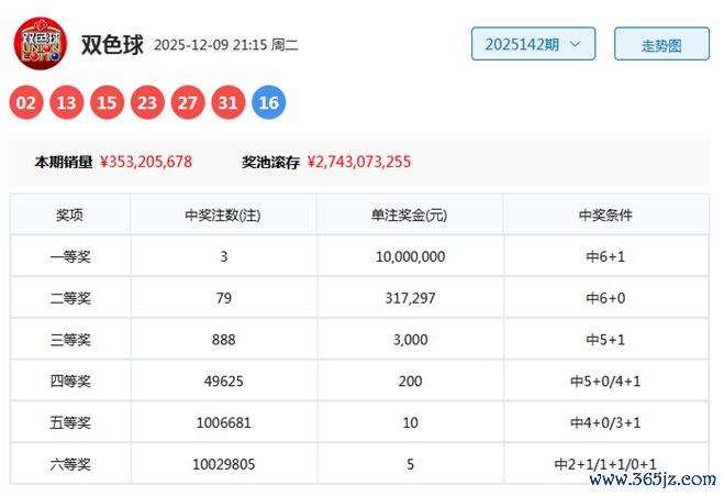 开奖归来:双色球第2025142期奖号为:02 13 15 23 27 31 + 16,其中红球号码奇偶比为5:1,大小比为3:3,012路比为2:2:2,三区比为1:2:3。